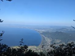 5合目までは全く視界が開けず、道を塞ぐように枝や木が横たわり、2度ほど頭を痛打しました。帰りを含めると4度も頭をぶつけてしまい、学習能力の低下を実感させられました(-_-;)。とはいえ、5合目まで耐え忍んだ甲斐があり、大海原が視界に飛び込んできたときの感動はひとしおでした。薩摩半島と向かい合う大隅半島や種子島、屋久島まで東シナ海の向こうに見える最高のロケーションです。
