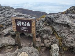 5合目には見晴らしの良い広場があり、韓国岳登山道休憩所という建物内でも休むことができます。標高が上がってくると上の写真のような赤色や黒色の石が多くなり、焼酎好きの私にとっては馴染みの深い、霧島酒造の「黒霧島」や「赤霧島」の名前とイメージが重なりました。といことで、麓の道の駅で宮崎県で限定販売していた「霧島」を購入して帰りました。