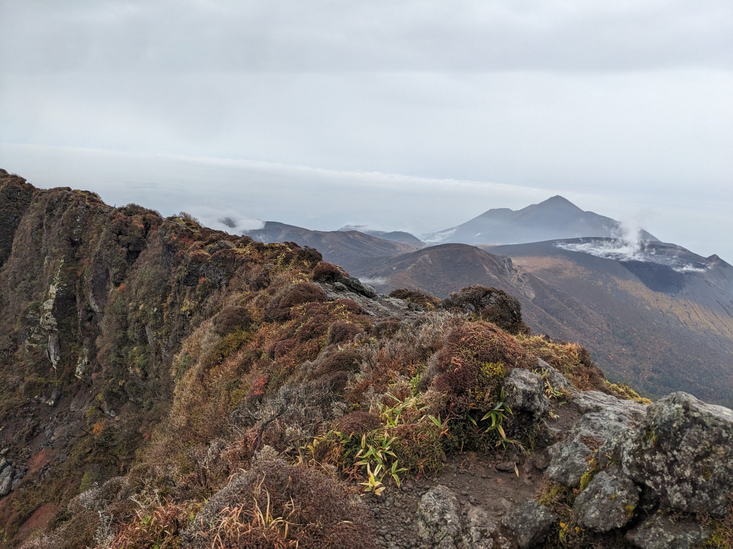 序盤から視界は良好で、そこかしこから火山活動による湯気が立ち上り、硫黄臭もするので非日常感が満載です。登山をしていても普段中々見れない景色が広がっているので歩き飽きることがありません。