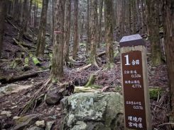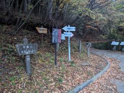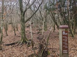 1合目から標識はキチンと整備されていて、1合当たり0.53㎞ピッチで立っていました。写真は1合、5合、8合地点のものを掲載しました。1合目は杉林、5合目は太めの広葉樹、8合目は細めの広葉樹といった感じで樹林帯であることは変わりありません。紅葉のシーズンに登ったことが唯一の救いで時折、色鮮やかな紅葉ゾーンを発見し景色を楽しむことができました。