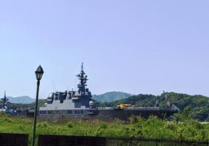 またこの駐車場の舞鶴海上自衛隊寄りのところでは、軍用艦船が間近で見られるので、上手くバイクを駐車すると軍艦をバックに記念撮影することもできます。駐車場は複数個所に分かれているので、自衛隊と離れた方に停めると見えないのでご注意ください。