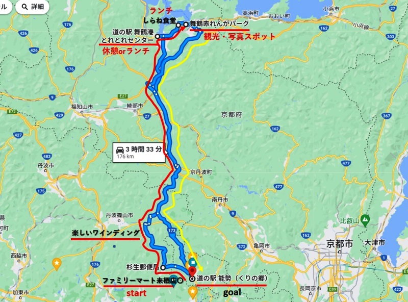 【ルート】能勢町のファミリーマート来栖店→道の駅 舞鶴港とれとれセンター→舞鶴 しらね食堂→舞鶴レンガパーク→さかなや水嶋鮮魚店→道の駅くりの郷