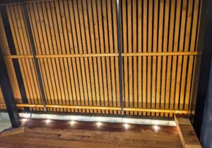ウッドデッキDIYの手順としては①資材調達②地面を平らにならして束石を敷き詰める③柱を立てて雨よけをつける④ウッドデッキ用の板を張る⑤残った資材を使って小型の腰掛を設置する⑥側面の雨よけにビニールカーテンをつける⑦ウッドデッキの一番端に間接照明を埋め込む、といった流れで進めました。これを週末2日をつかって6週間ぐらいで仕上げるイメージではじめました。