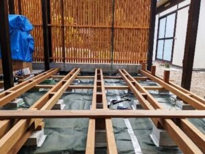 柱や根太もアマゾンアンジェリーナにしたのですがあとで考えてみると加工が容易で廉価なホワイトウッド等にして腐食防止用の塗料を塗れば良かったのかも知れません。ただ柱と根太と床板が醸し出す一体感、重厚感は異なるような気もします・・・自己満足の境地。