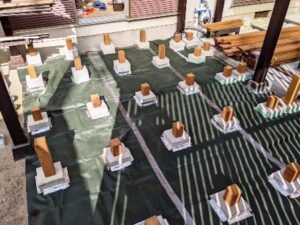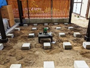 ②以前は小さな砂利が敷き詰められていたのですが、その砂利は孫の遊び場用に別のスペースに移動させレーキで土を平らに均しました。その土を掘って穴を掘り束石を埋設してコンクリートで固めました。束石の水平を保つためにレーダー水平器(ONE STEP レーザー墨出し器5ライングリーン水平器)を活用しました。精度的には問題なくレーザーで束石を置いた後にアナログ水平器(新潟精機SKアルミ水平器マグネット付300㎜)で確認したところ差異はほとんどありませんでした。また付属のバッテリー2個もストレスなく使えており、僕のDIYレベルでは1個でも十分もちました。あと地面には防草シート(IKTECS防草シート130g/m2の厚手)をはり継ぎ目をテープ(3Mスコッチダクトシールテープ幅48㎜)で貼り合わせました。ウッドデッキの下で雑草が生えてくると除草に手間取るので、極力未然に防いでおきました。