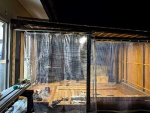 ⑥庭側の出入り口として全面ビニールカーテン(FT06防炎透明糸入りPVC0.35㎜厚)を上部に取り付けたカーテンレールから吊り下げて設置しました。寒さ対策と風雨除けになるので設置して良かったです。天気の良い日は端に畳んでおくことができるので解放感MAXで満足です。これでようやくバイクガレージとウッドデッキが横並びで完成しました。あとは正月に家族や友人が集まるのを待つのみです。すでに季節は冬に差し掛かってきました。もやもや病発症まで1か月を切っています。疲れやすくなったという自覚は徐々に出てきているもののDIYをしてるからだろうと思って気にもとめていませんでした。仕事の方も年末商戦真っ只中、今思えば心身共に負荷がかかっていました。