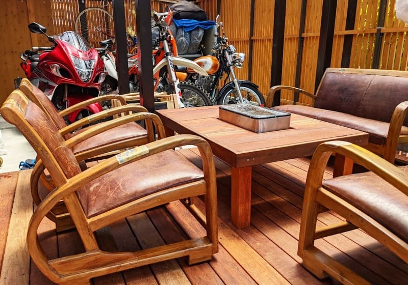 ①資材調達についてメインの木材については2021年後半にはウッドショックと言われる木材価格の高騰がニュースになり、実際にホームセンターでも値上げの嵐となりましたが、10月ごろは値上げは決まっているもののまだ実施されていないといった最後のタイミングでした。耐久性と風合いからハードウッドにしたいと考えていました。人工木も選択肢のひとつでしたが、使用頻度が高く、寛ぐ場なので多少の耐久性は大目にみて質感重視で決めました。とはいえ、青天井に予算があるわけではないので、ハードウッドの中では廉価なアマゾンアンジェリーナ(厚20㎜・幅105㎜・長3,600㎜をカットして使用)という木材に決めました。