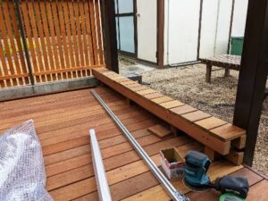 ⑤余った板材で小型の腰掛ベンチとテーブルををつくります。このベンチが以外にも昼寝するときに重宝しています。ちょうど肩甲骨の間にこの小さなベンチがはまり込んで姿勢が伸びてほんとに気持ちが良いんです。廃材もうまく活用すると重宝します。孫たちは縁側替わりに砂利が敷き詰めてある側に座っておやつを食べたり、冷たいものを飲んだりする休憩スペースにしています。※テーブルはブログ表紙の写真に写っているのでご参照ください。