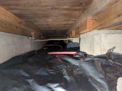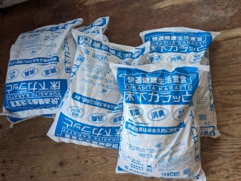 湿度対策では地面がむき出しだったので、そこに防湿シートを張り、その上に「床下カラッと」という乾燥剤的な小石を敷きつめました。