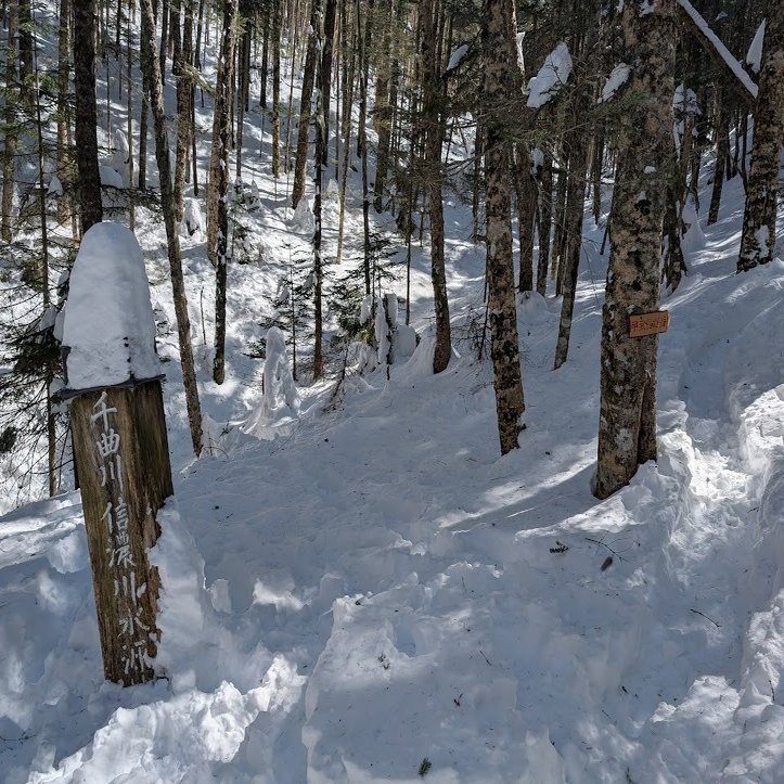 前日の21日にも来たというカップルの話によると、昨日は登山口から千曲川の源流までの間もトレースがなく、雪をかき分けて進むラッセル続きで、源流まで来た時にはタイムオーバーとなり登山口に引き返したそうだ。