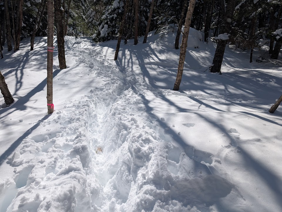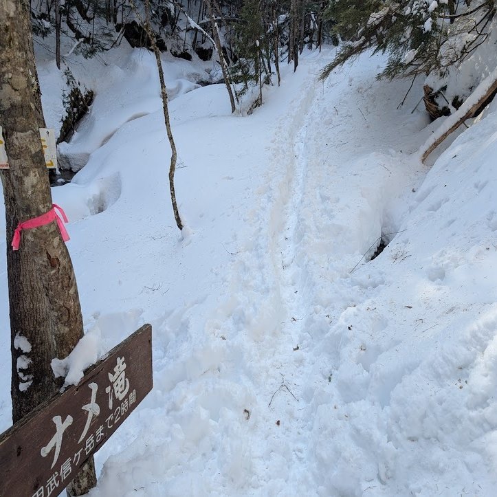 しかし、冬場のトレースは大雪が降ると全くなくなり、木に括り付けられたピンクテープを頼りに登ることもあります。