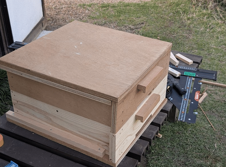 サイズ感はネットで検索した養蜂箱の写真を参考に4方の幅は約450㎜、1段の高さは125㎜にしました。蜂の入り口部分は8㎜の高さで幅150㎜程度にしました。