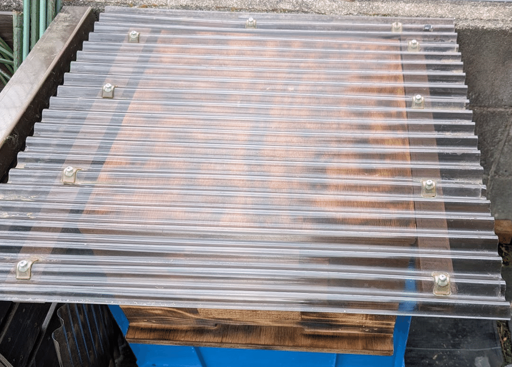 あと雨避けのためにポリカーボネート波板に木枠を付けてかぶせました。横にも余ったポリカをおいて雨の侵入を防ぎました。