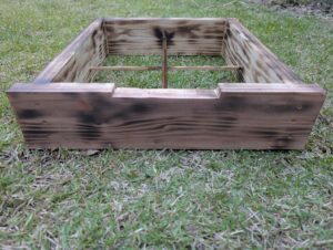 1段ごとに蜂の巣落下防止のため、十字に棒を通してひっかかりを付けました。あとは、殺菌と腐食防止のためにバーナーで焼目をいれて、蜜蝋を内部に塗り付けました。