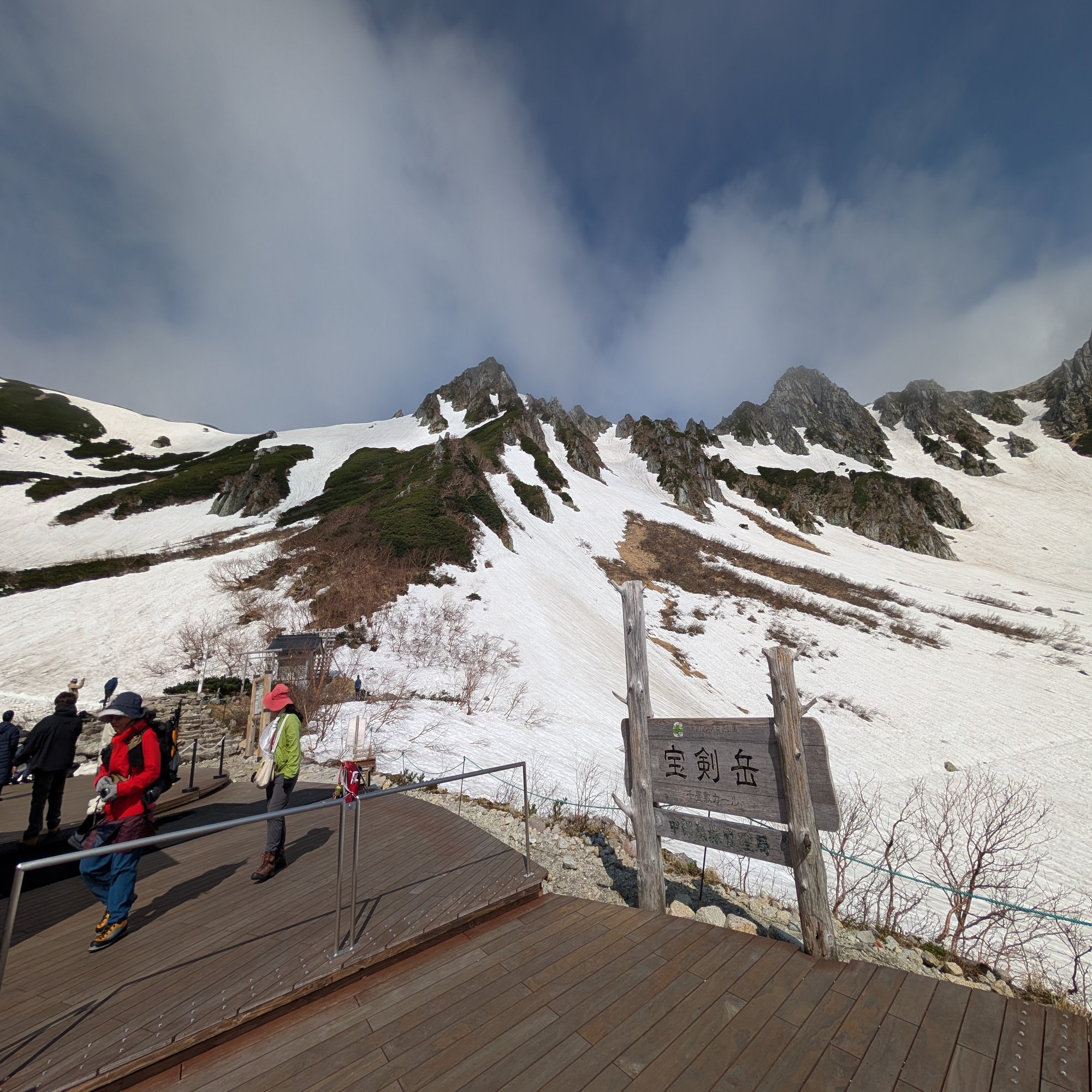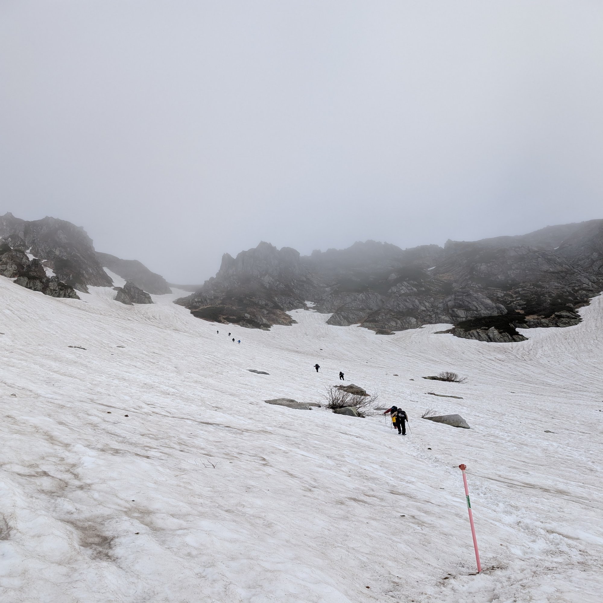 千畳敷駅を出てすぐの登山道はシャーベット状の雪渓で、はじめの平坦部は観光客もスニーカーで歩いていました。靴が濡れることを除けば、問題なく歩けます。