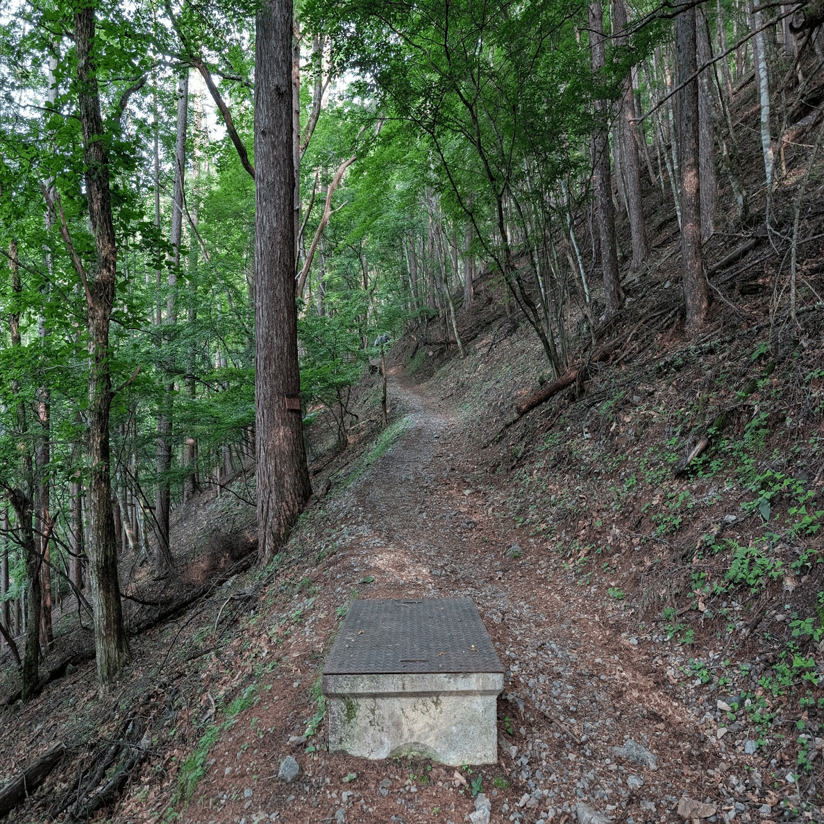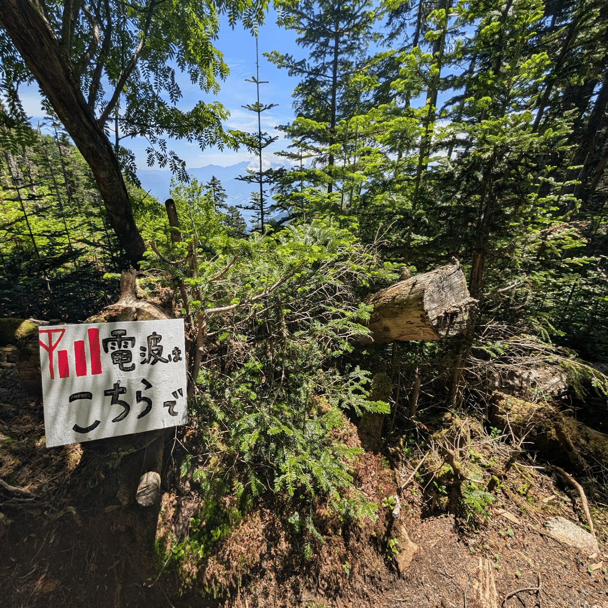 同じような登り一辺倒の樹林帯を約3時間程度歩いたところで、ようやく下り道に差し掛かり、その後、上り下りを繰り返して、約1時間後に電波が入る場所(掲示あり)に出ました。前夜の駐車場からずっと電波が届かないエリアだったので、ここでメールの確認なんかを済ませました。(この先のテント場は電波は届きません)