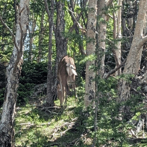 登山口から約3時間は緩やかな登りでひたすら樹林帯の中を進む形です。途中、開けたところがあり、そこで、鹿に遭遇しました。風もなく穏やかな天気だったので、ゆったり若葉を食むでいました。