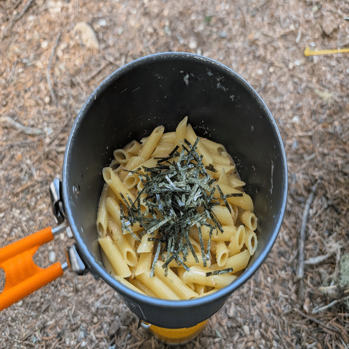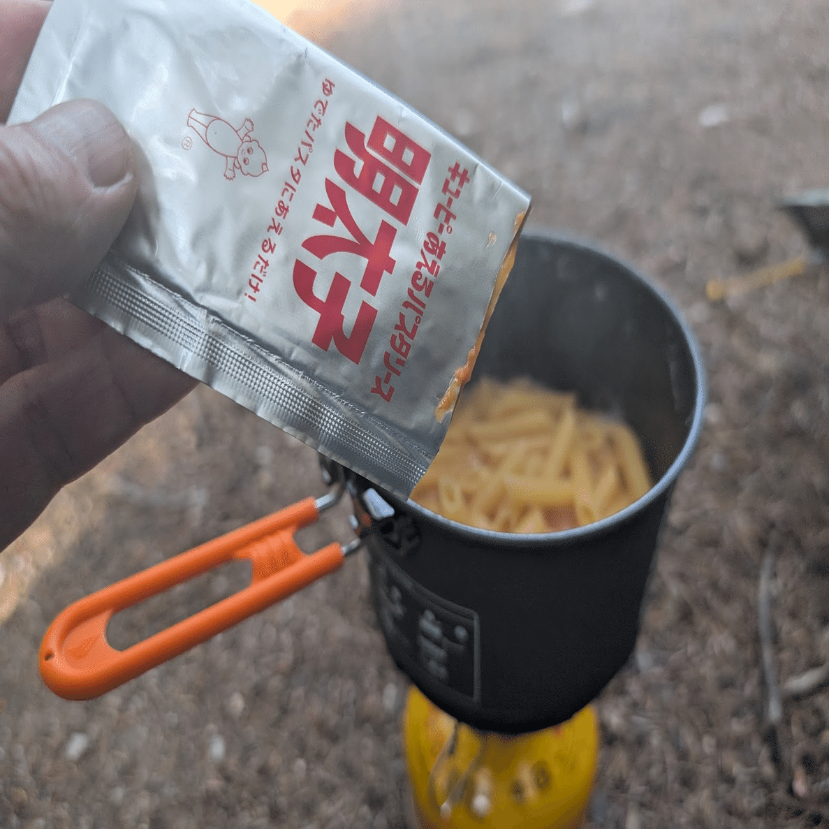 夕食は重さにもめげずに担ぎ上げたセブンのおでんとその残り汁でペンネをボイルして、乾燥明太子ソースを合えて食べました。おでん出汁が利いてペンネがとても美味しくなりました。ゴミも出ないので、一石二鳥です。味変で裂けるチーズ絡めて最後まで飽きずに食べることが出来ました。