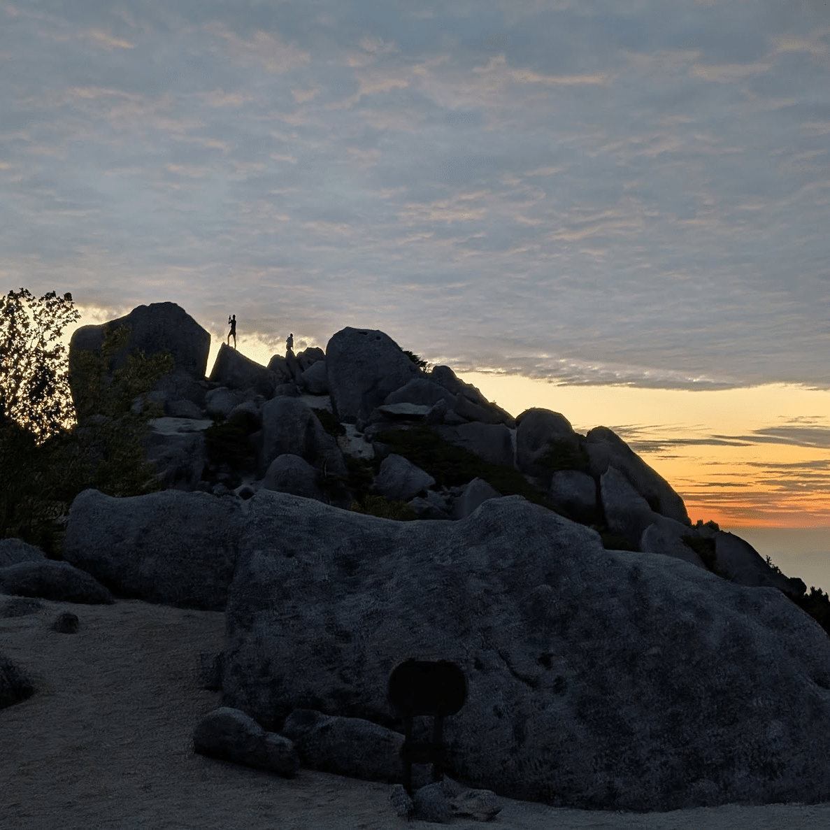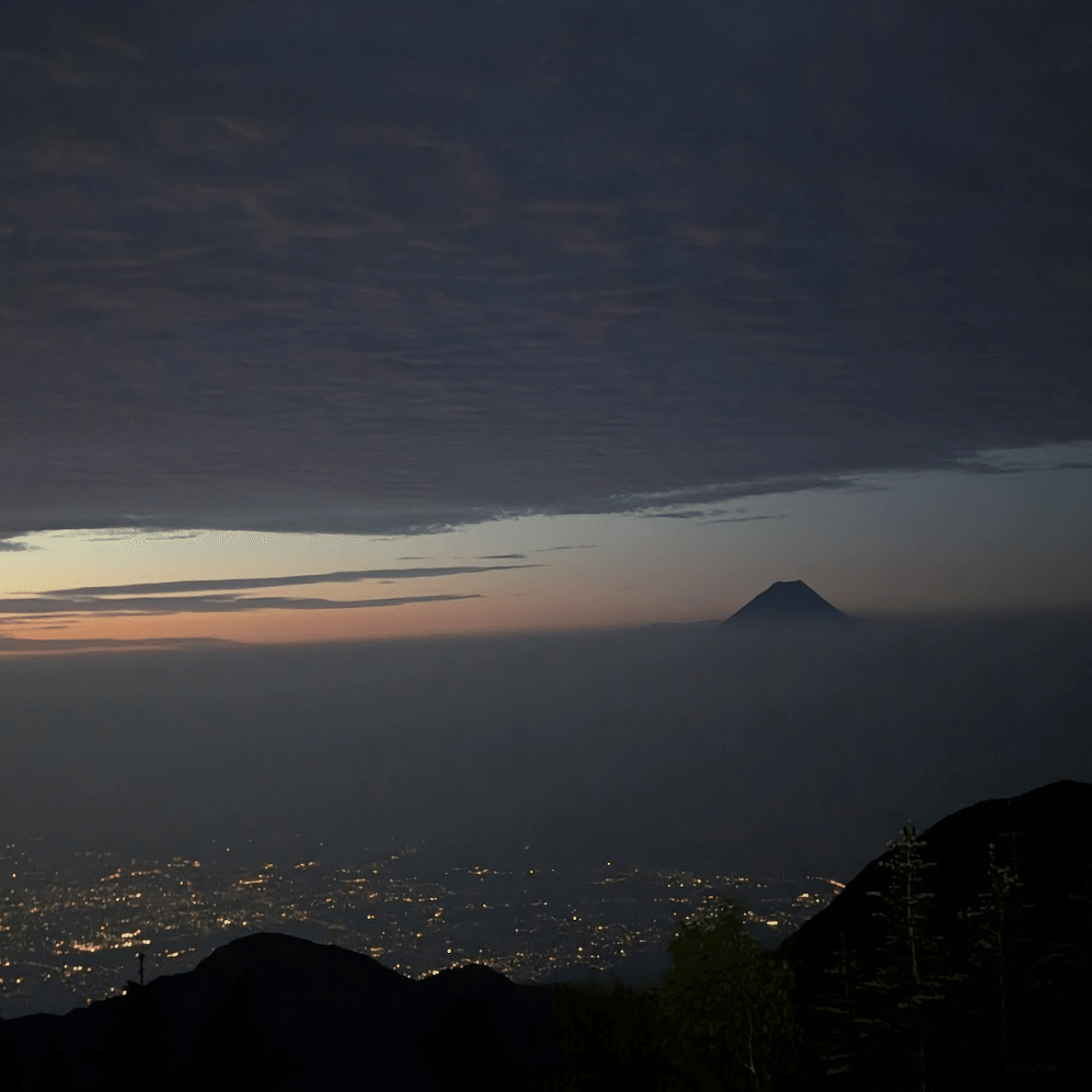 1時間ほど歩くと雲間から薄っすらと朝焼けが見え始めました。続いて富士山も顔を覗かせてくれました。