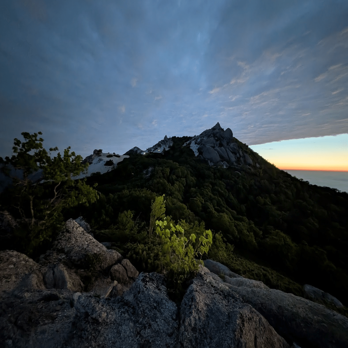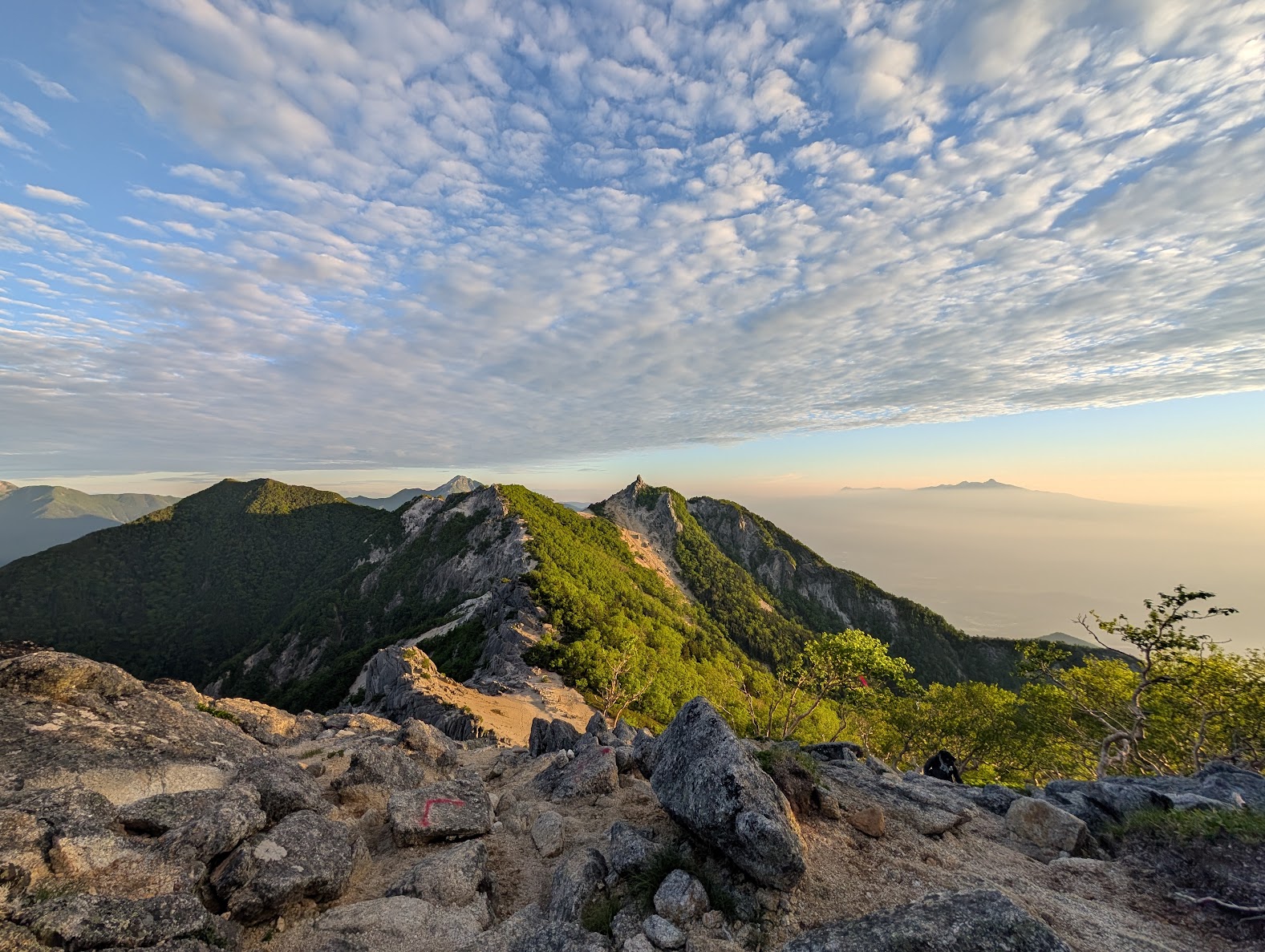 太陽の光と雲の加減が刻々と変化していくので、景色もそれに応じて変わるので、なかなか前に進むことが出来ないくらいでした。はじめは薬師岳の頂上で日の出を迎えようと思っていたのですが、稜線沿いはどこも最高の景色だったので、山頂を意識することなく、好きなところで立ち止まって刻々と変わる景色を楽しみました。