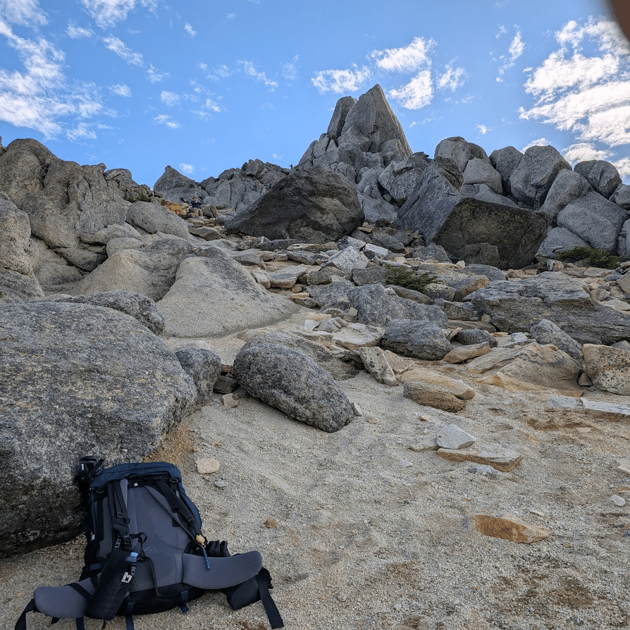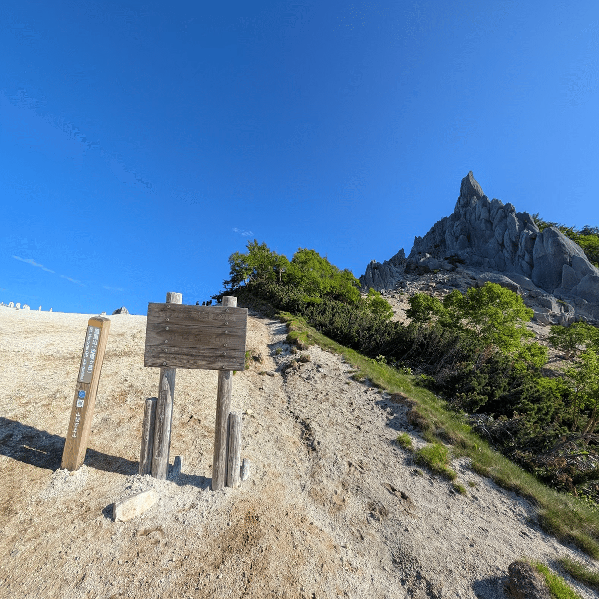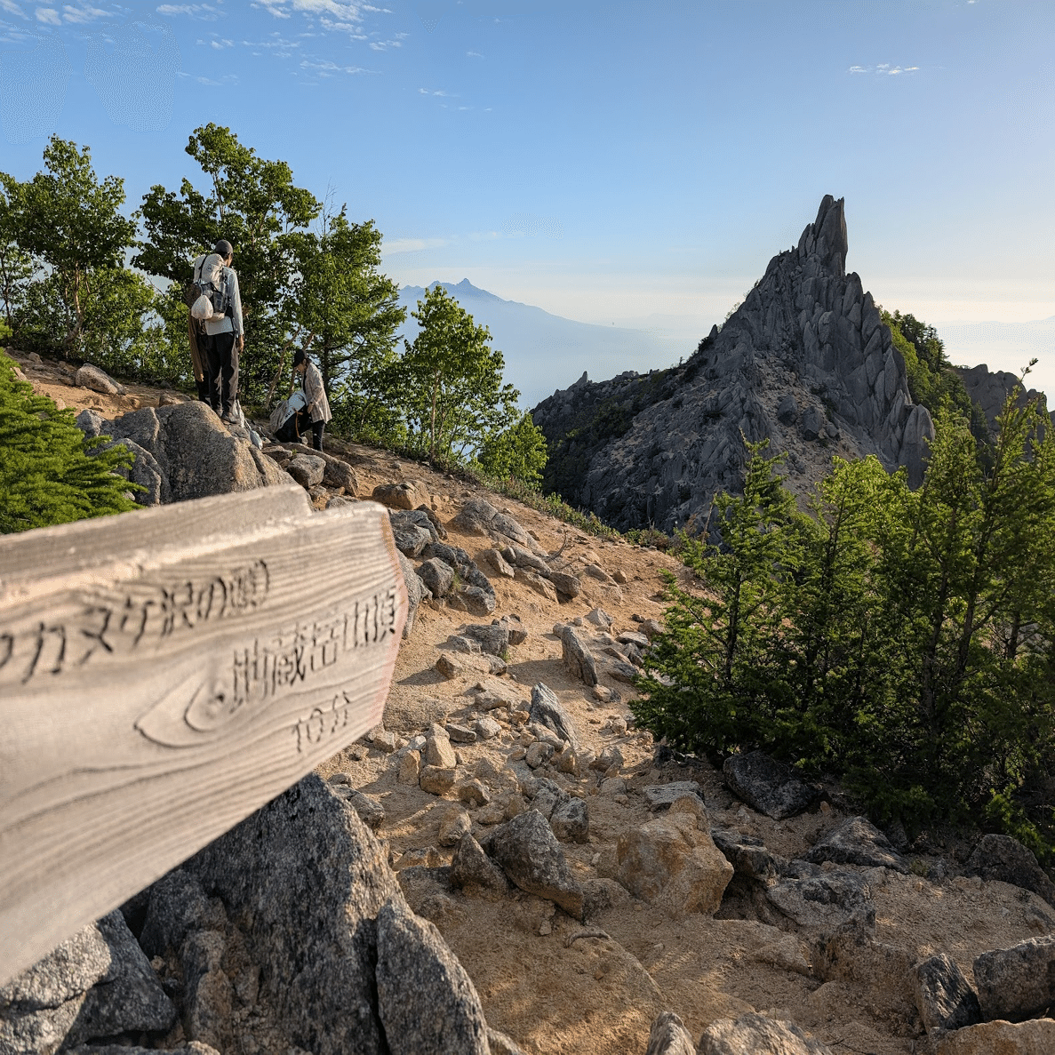 途中の偽ピークを見て、あと少しと考えずに、この木製看板を目指した方が精神衛生上良さそうです。この場所からは、オベリスクも含めて地蔵ヶ岳の山頂が目視できるので、期待を裏切られることがありません。