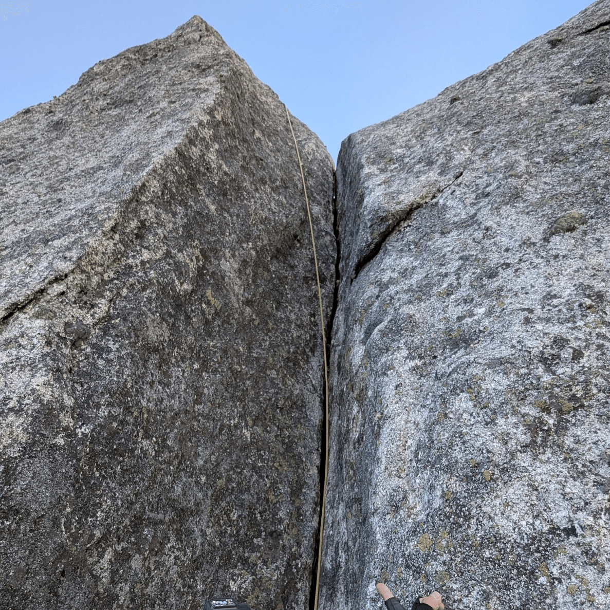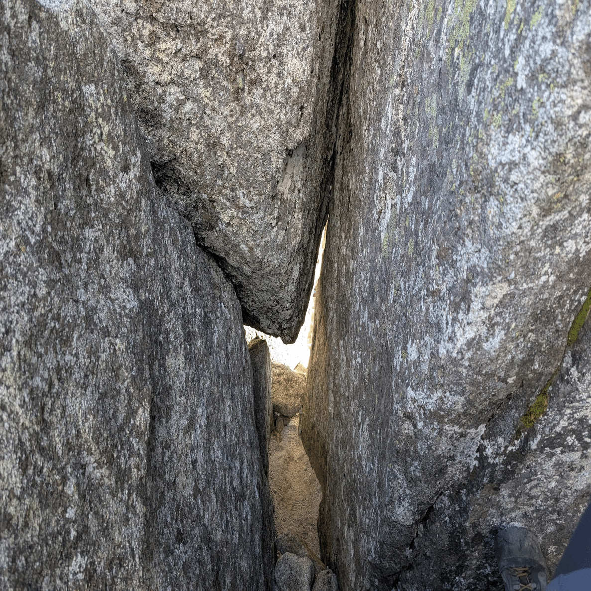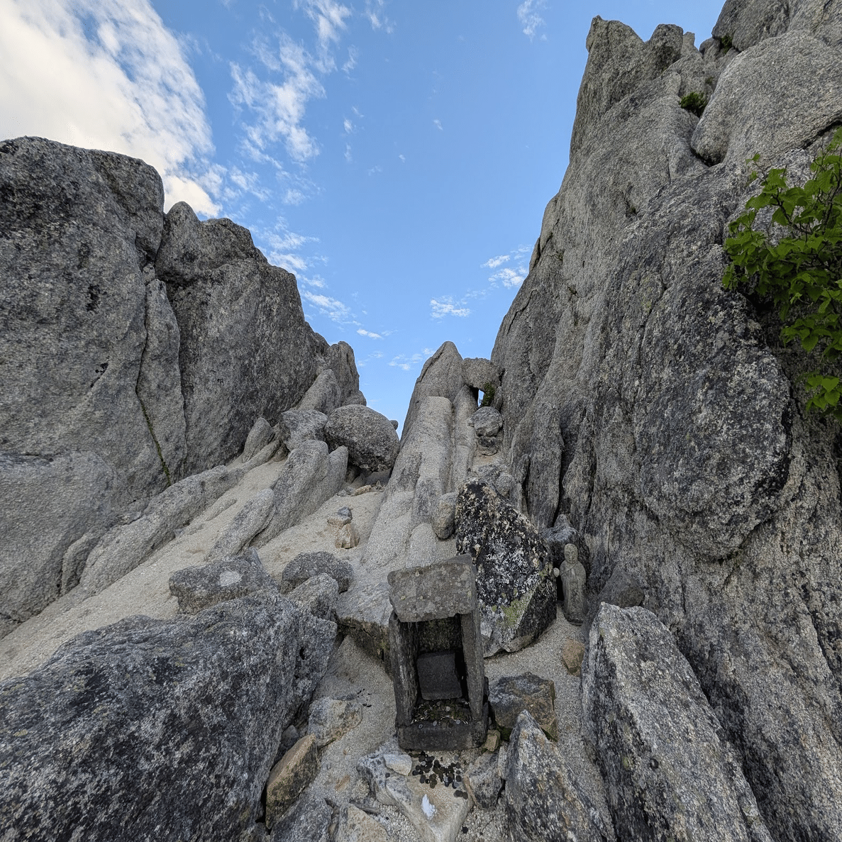 ここをくぐったところで、引き返しました。取り付きのない2つの岩とロープだけを頼りに登る形だったので、身の危険を感じてやめときました(笑)