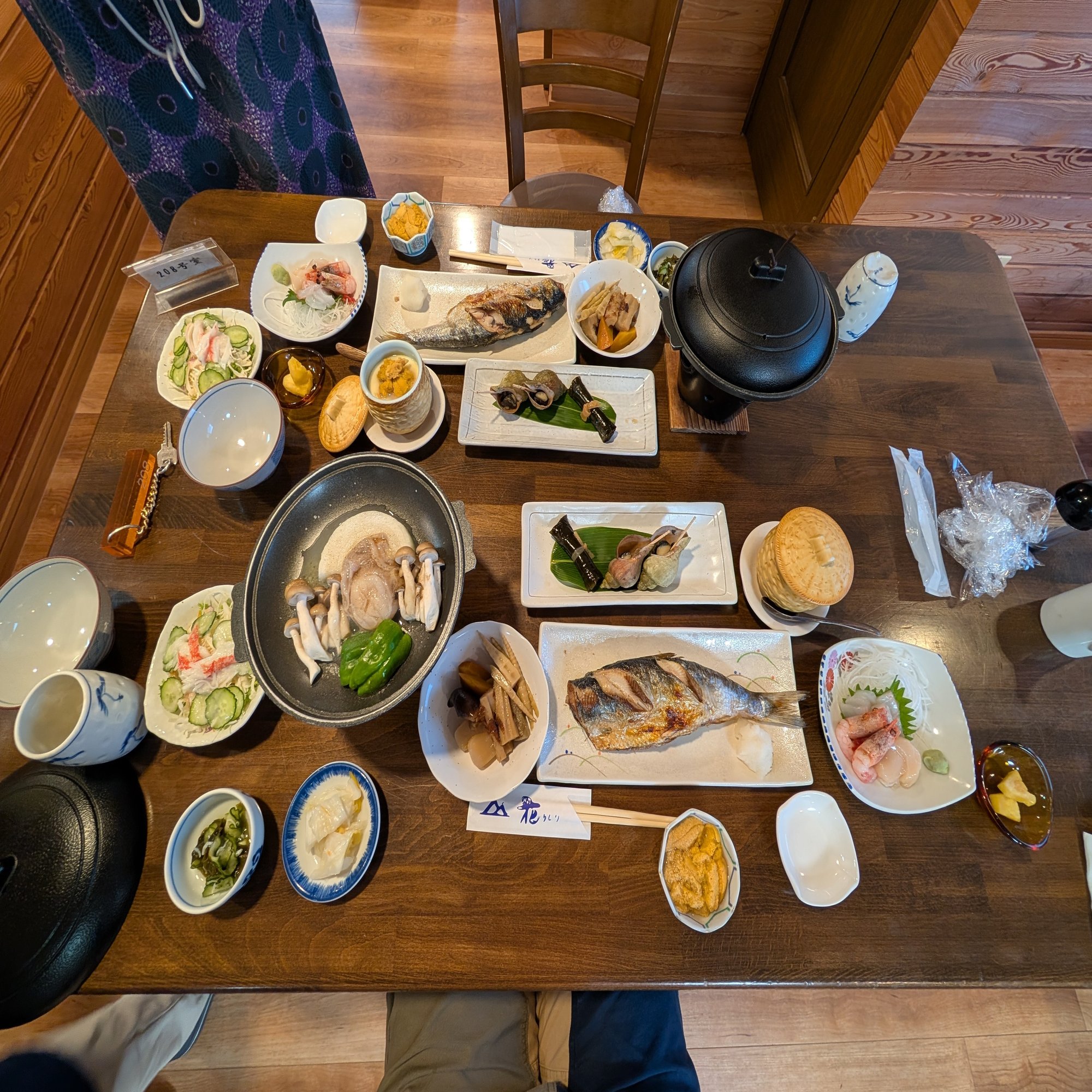 「花りしり」さんの夕食は、ウニ(丼)、季節の刺身、ホタテ焼、ニシン焼、ウニたっぷり茶碗蒸しその他、味・鮮度・郷土色・品数・ボリューム、どれをとっても最高でした。