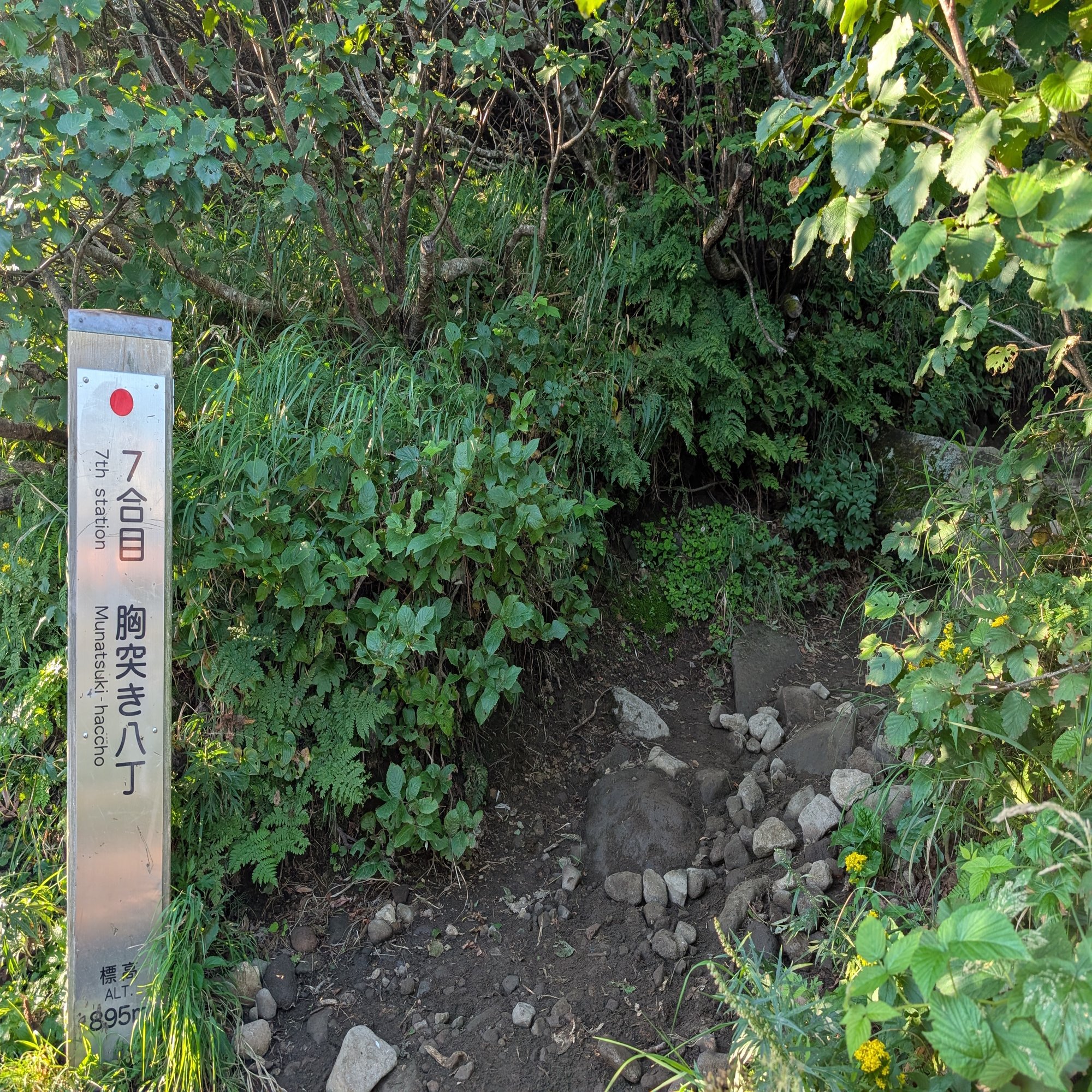 7合目の標識には、「胸突き八丁」という記載があり、ここから角度が急になり、まさに正念場でした。