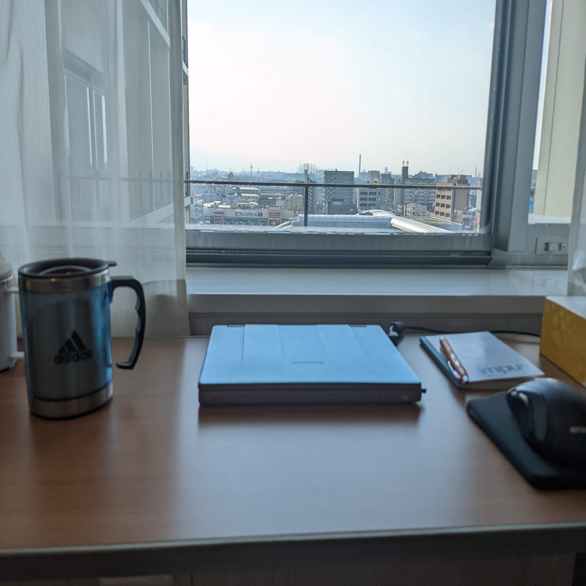 また、仕事をする体力のようなものが落ちてしまわないように、ベッドの上にあるテーブルを窓際に移動させて、そこに洗面台にある椅子を持ってきてオフィスっぽく整えてそこで日中は過ごすようにした。